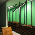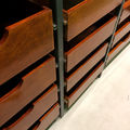 Principais elementos desse projeto, as duas estantes são conformadas a partir de traves em metalon que servem de estrutura onde estão instaladas prateleiras em compensado naval e onze tipos de gavetas de reuso.